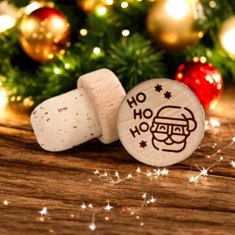 Bouchon de vin en bois de hêtre et liège 100% naturel « Ho ho ho », dessiné et fabriqué par Boréo dans son atelier Strasbourgeois, d’un diamètre de 19,5 mm.