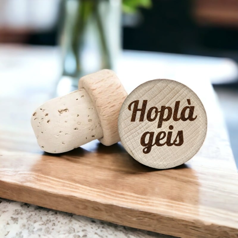 Bouchon de vin en bois de hêtre et liège 100% naturel « Hoplà geis », dessiné et fabriqué par Boréo et ses patounes dans son atelier alsacien, d’un diamètre de 19,5 mm.