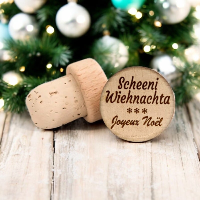 Bouchon de vin en bois de hêtre et liège 100% naturel «Scheeni Wiehnachta * Joyeux Noël », dessiné et fabriqué par Boréo dans son atelier Strasbourgeois, d’un diamètre de 19,5 mm.
