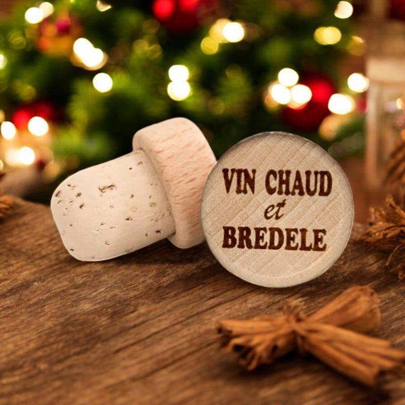Bouchon de vin en bois de hêtre et liège 100% naturel « Vin chaud et bredele », dessiné et fabriqué par Boréo dans son atelier Strasbourgeois, d’un diamètre de 19,5 mm.